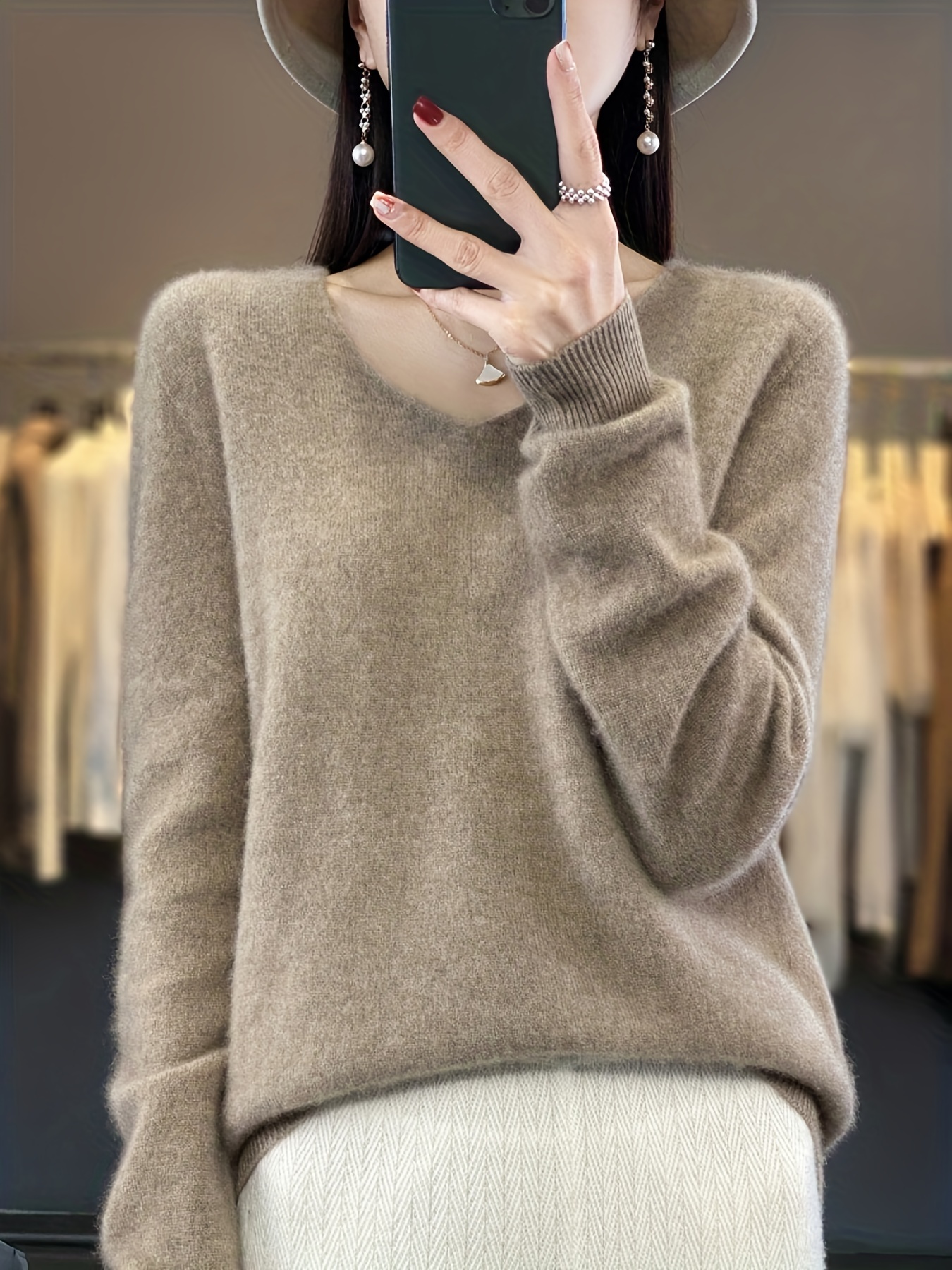 Solid Simple Knit Sweater, Elegant V Neck Long Sleeve Sweater, Women’s Clothing