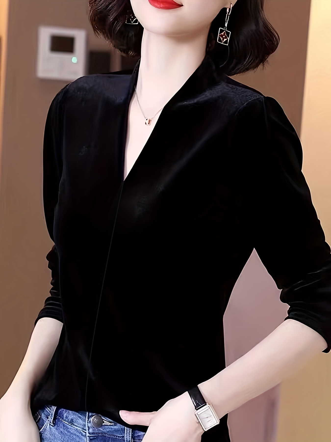 Solid V Neck Velvet Top, Elegant Long Sleeve Pullover Sweater, Women’s Clothing