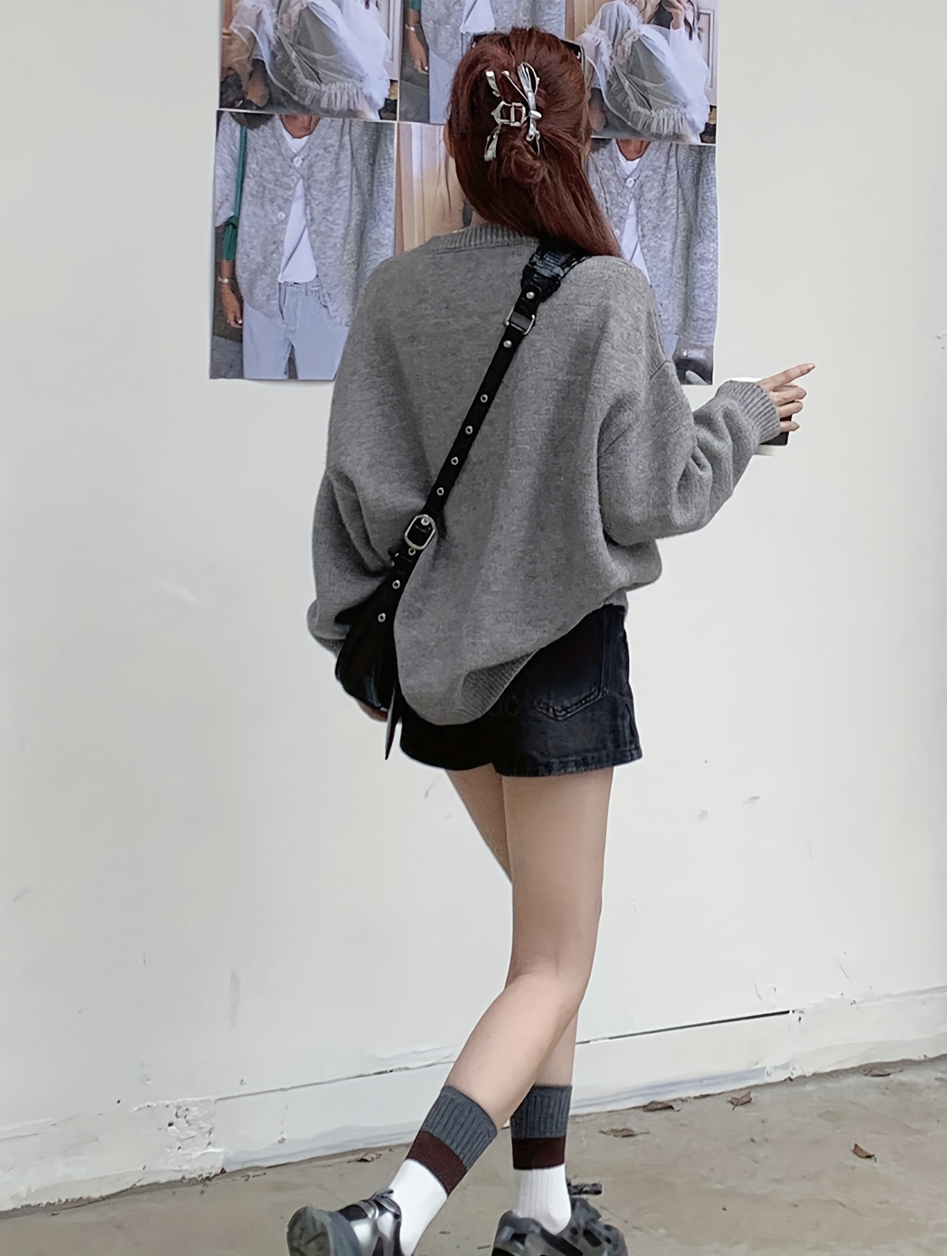 Star Pattern Crew Neck Knit Sweater, Y2K Long Sleeve Pullover Sweater, Women’s Clothing