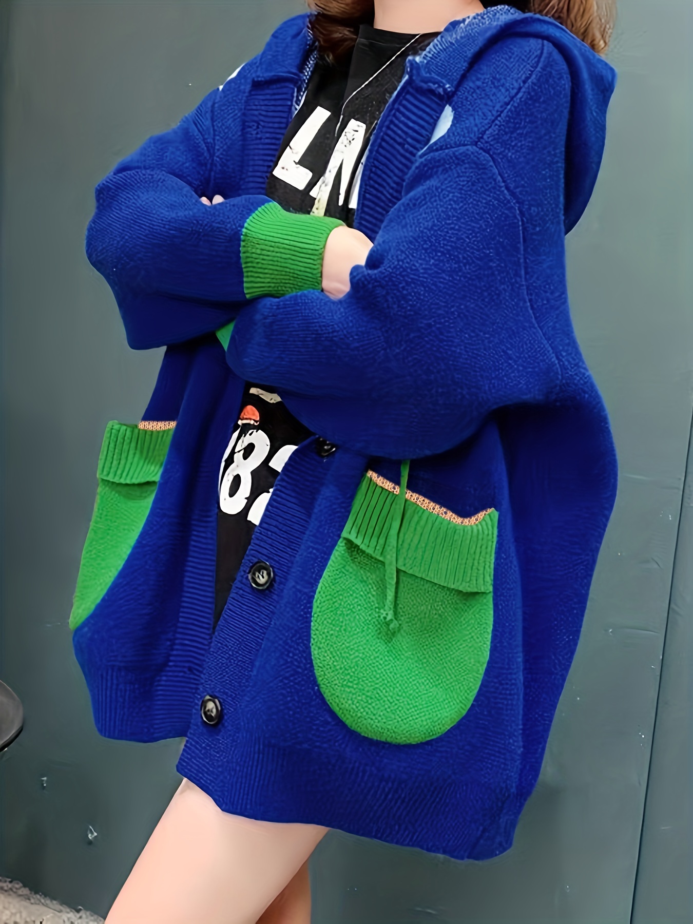 Graphic Pattern Drawstring Hooded Knit Cardigan, Cute Button Down Long Sleeve Oversized Sweater, Women’s Clothing