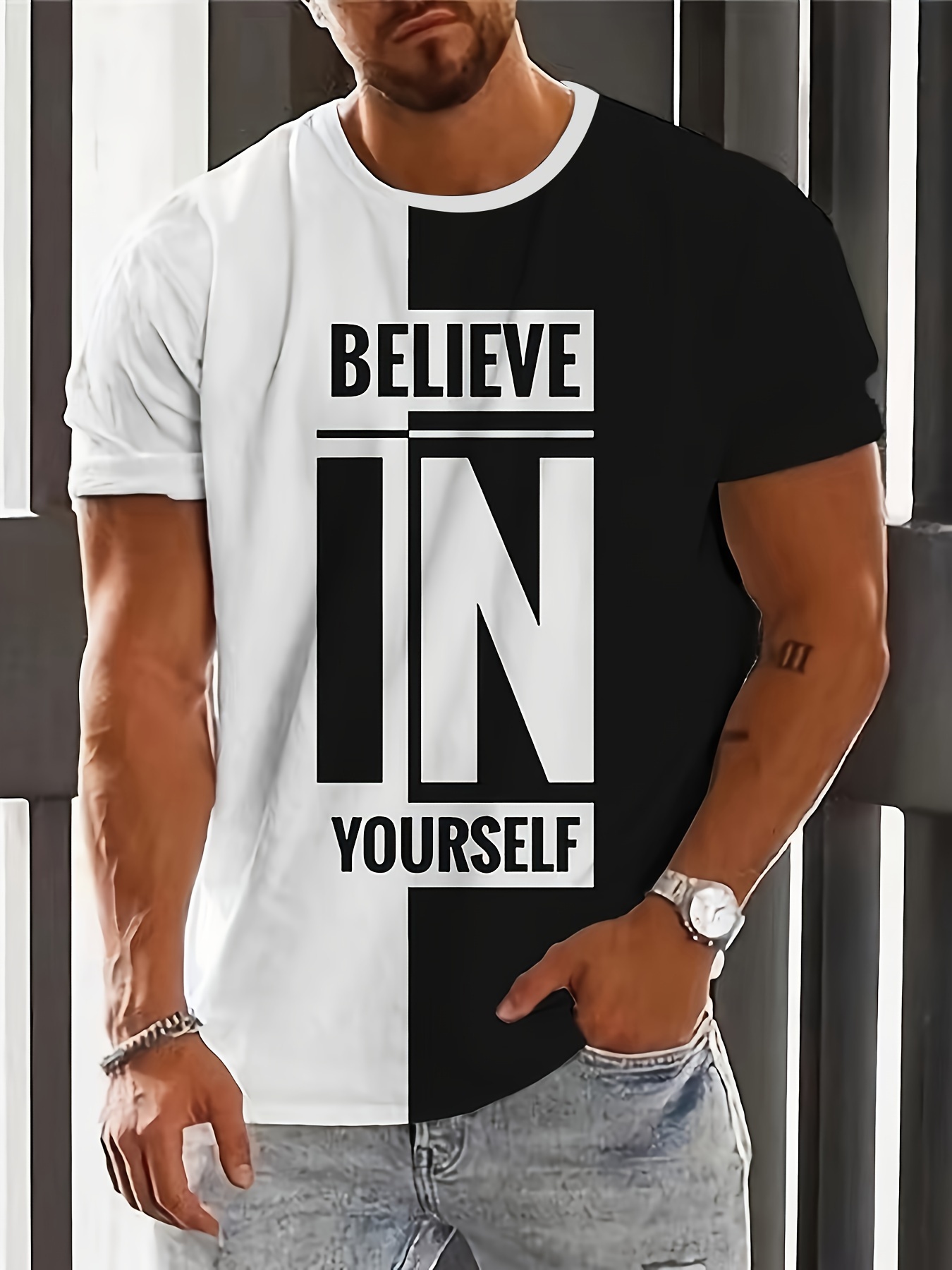 Men’s Stylish Believe In Yourself Pattern Shirt, Casual Breathable Crew Neck Short Sleeve Tee Top For City Walk Street Hanging Outdoor Activities