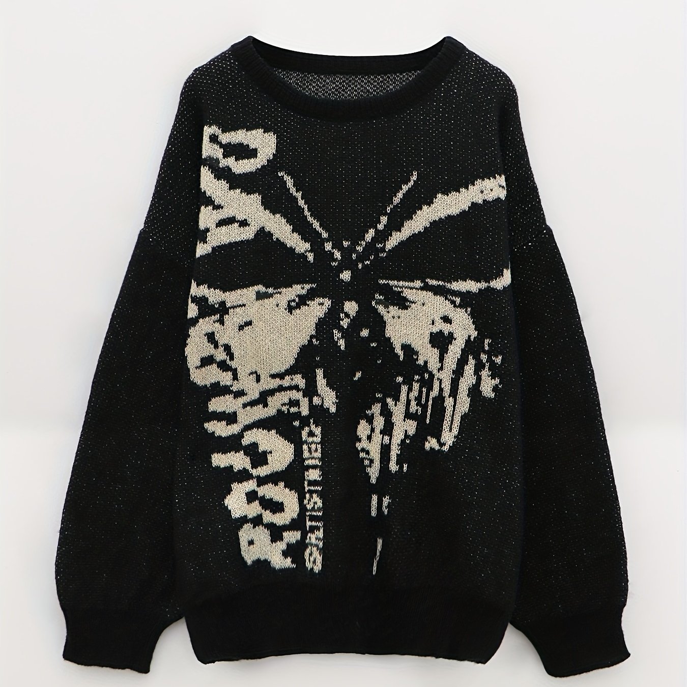 Home Women's Sweaters Butterfly Pattern Knit Sweater, Y2K Crew Neck Long Sleeve Sweater, Women’s Clothing