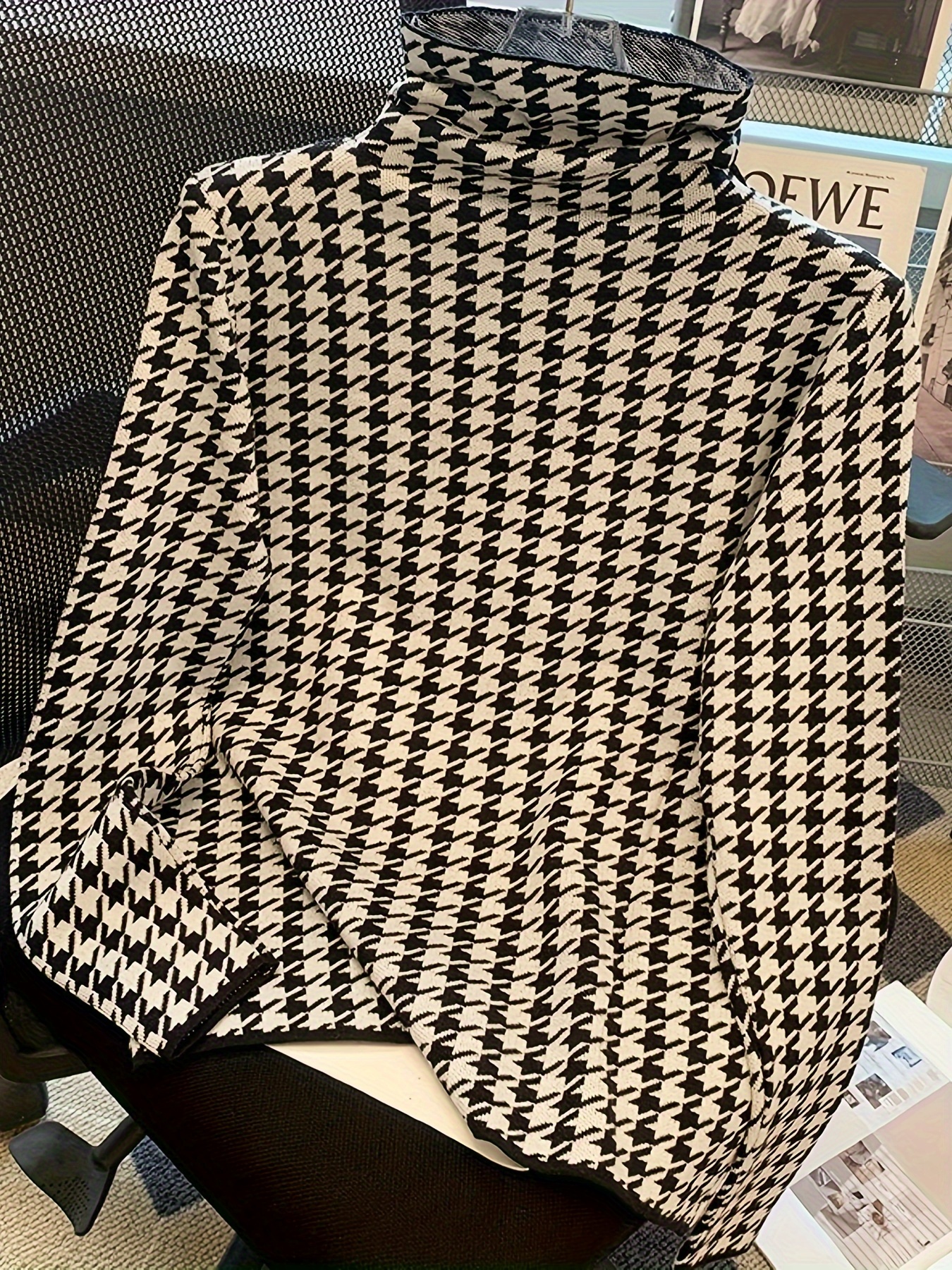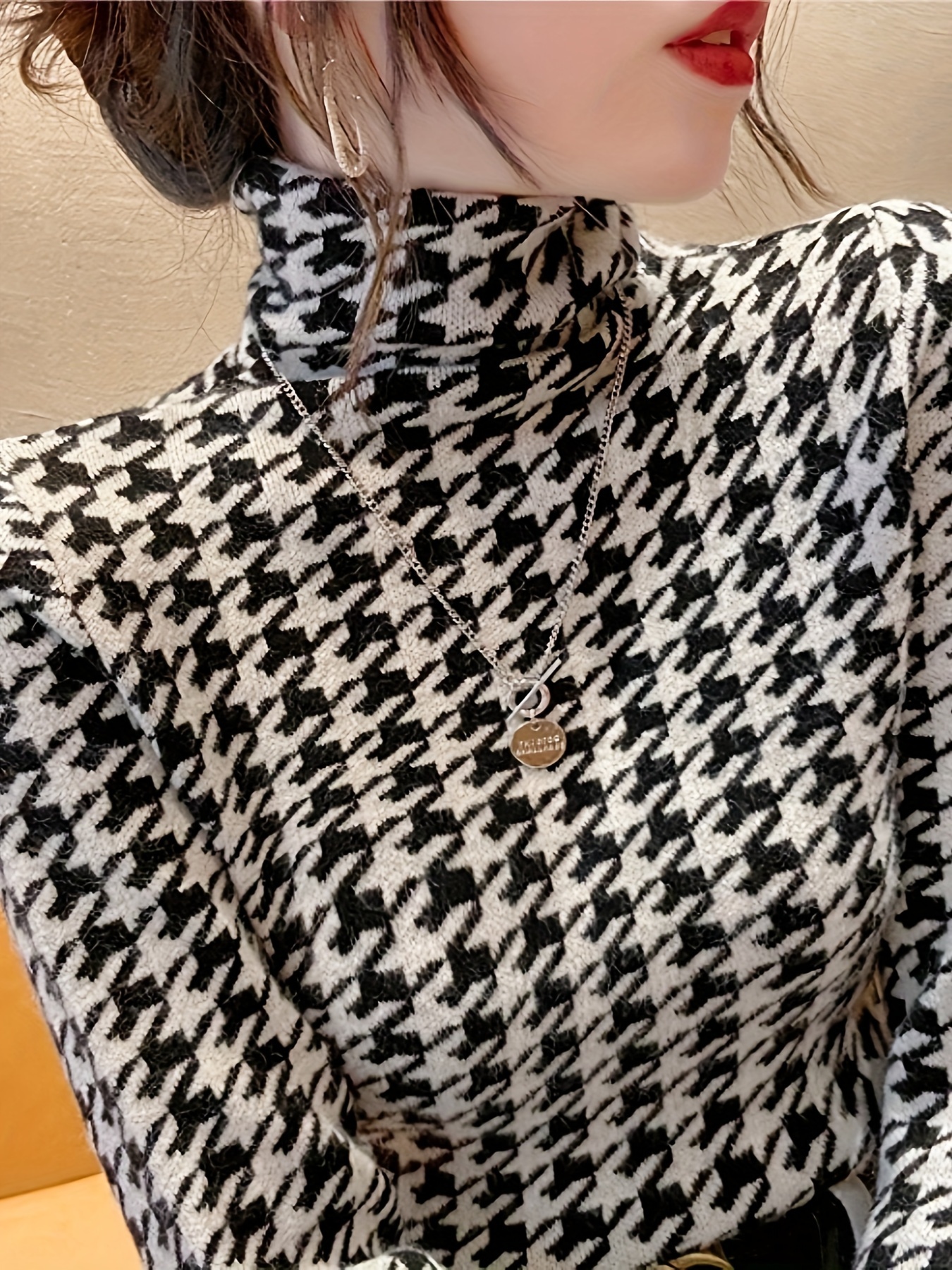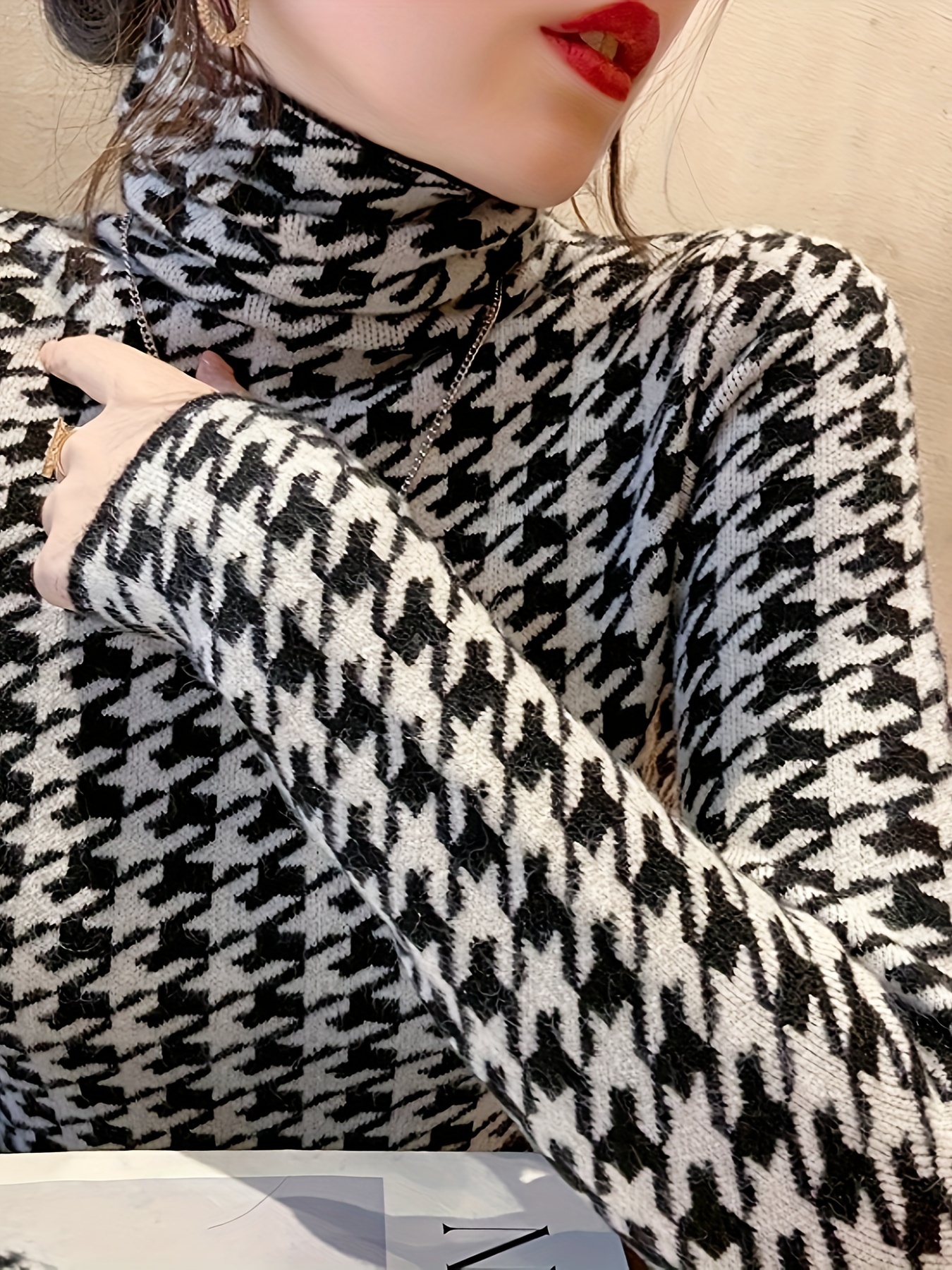 Home Women's Sweaters Houndstooth Pattern Turtle Neck Pullover Sweater, Elegant Long Sleeve Slim Versatile Sweater, Women’s Clothing