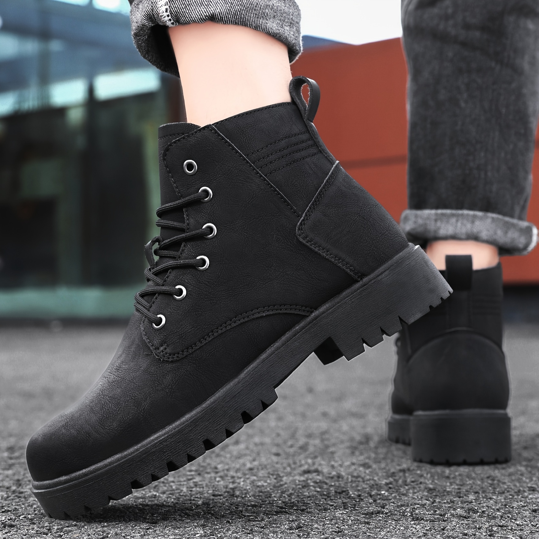 mens solid color casual ankle boots breathable anti skid lace up boots with pu leather uppers for outdoor details 1